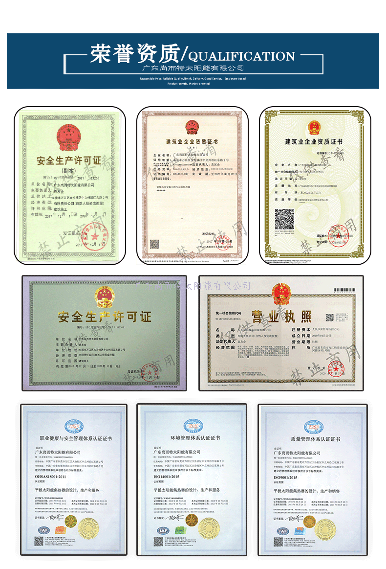 5、玻璃的自爆率低:平板太陽能集熱器采用高純度原材料,相對普通玻璃不含各種引爆雜質,從而大大降低了鋼化后的自爆率。顏色一致性:超白玻璃采用先進的色度分析儀和分析軟件,確保了玻璃顏色的一致性。可見光透過率高,通透性好:大于93%的可見光透過率,使平板太陽能集熱器得到更多太陽能量。紫外線透過率低:降低對其他材料的老化影響;